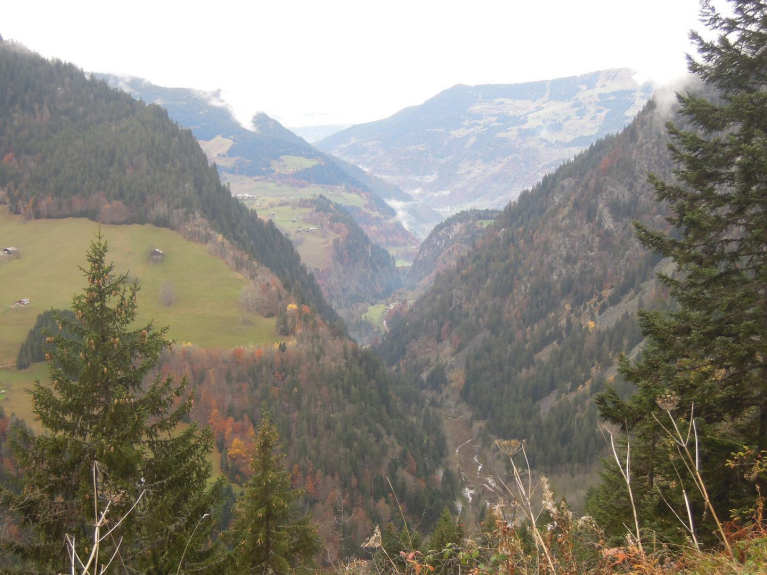 Großer Balkon und Holzterrasse nach Südwesten. Blick auf das Tal.