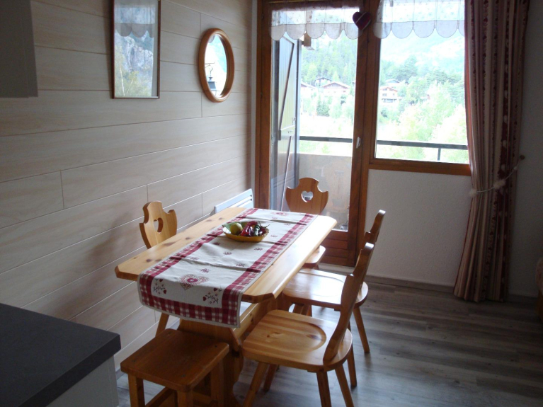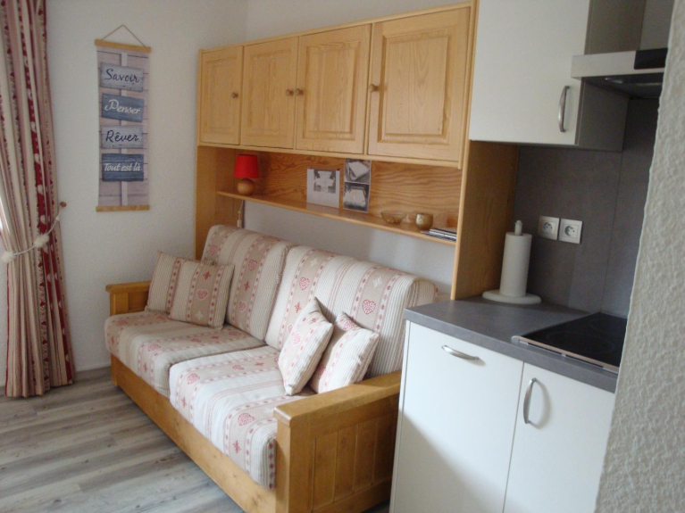 Schönes und freundliches Studio mit Bergecke. Sehr funktionell in der Nähe der Lifte und Geschäfte in einer ruhigen Gegend mit Blick auf den Vanoise Park. Ausgestattete Küche mit Geschirrspüler, Kühlschrank, Backofen, Toaster, Brot, Filterkaffeemaschine und Raclette-Set, Fernseher.