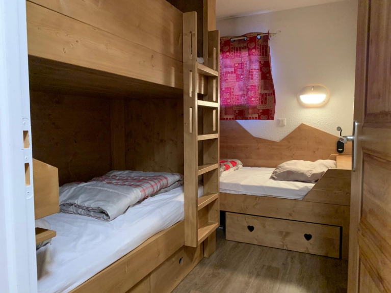 - Ein Schlafzimmer mit einem Etagenbett, Schrank mit Garderobe.