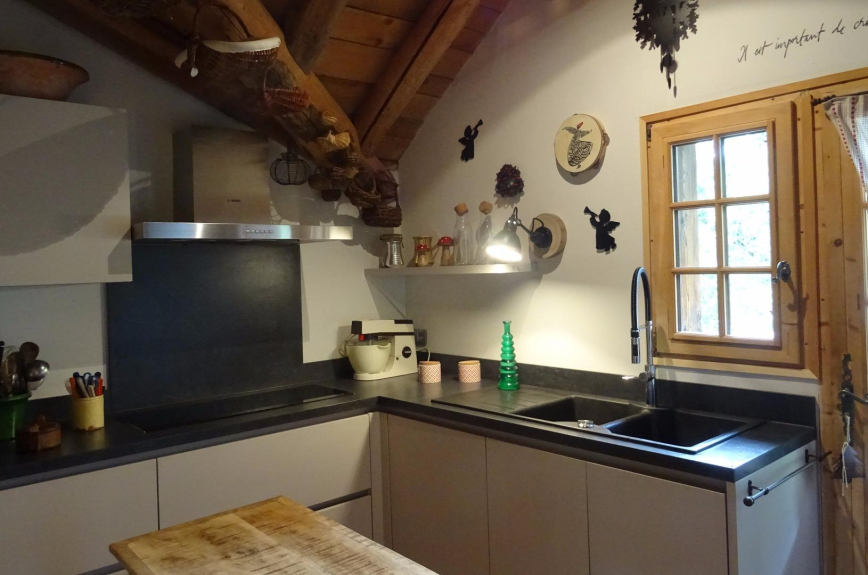 Einbauküche, Kühlschrank, Induktionskochfeld, Backofen, Mikrowellenherd, Geschirrspüler, Kaffeemaschine, Nespresso-Maschine, Toaster, Raclette- und Fondue-Maschine.