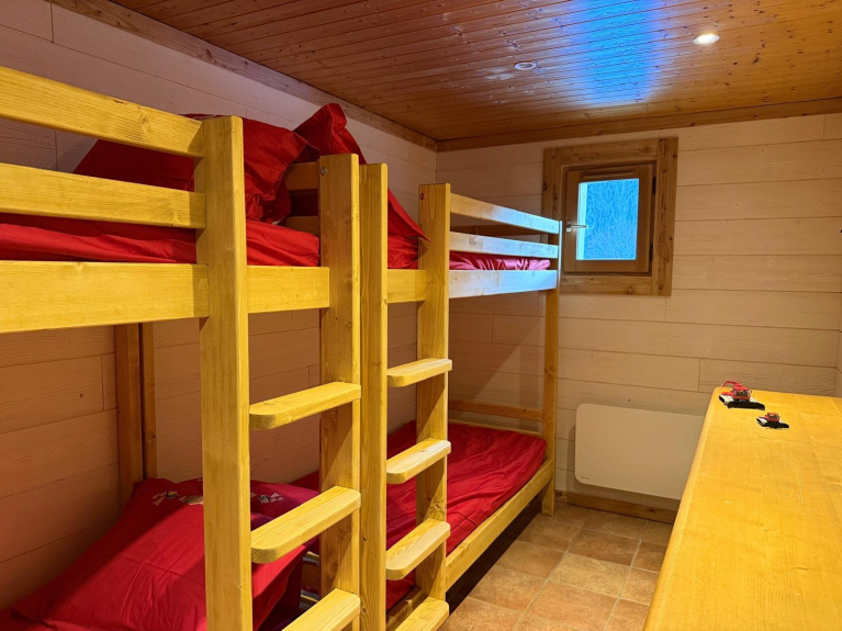 - Auf Ebene 0: Flur, ein Schlafzimmer mit einem Doppelbett 140 cm, ein Schlafzimmer mit zwei Mal zwei Etagenbetten (2 x 2x 80 cm), ein Badezimmer und ein WC.