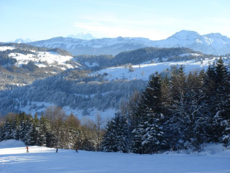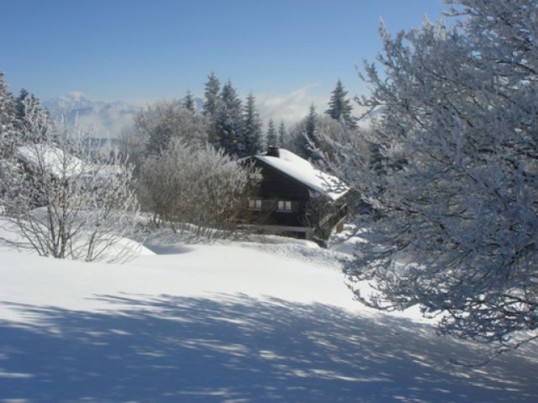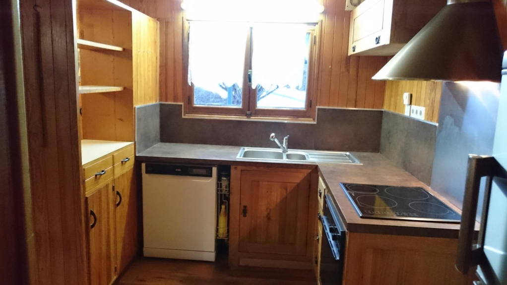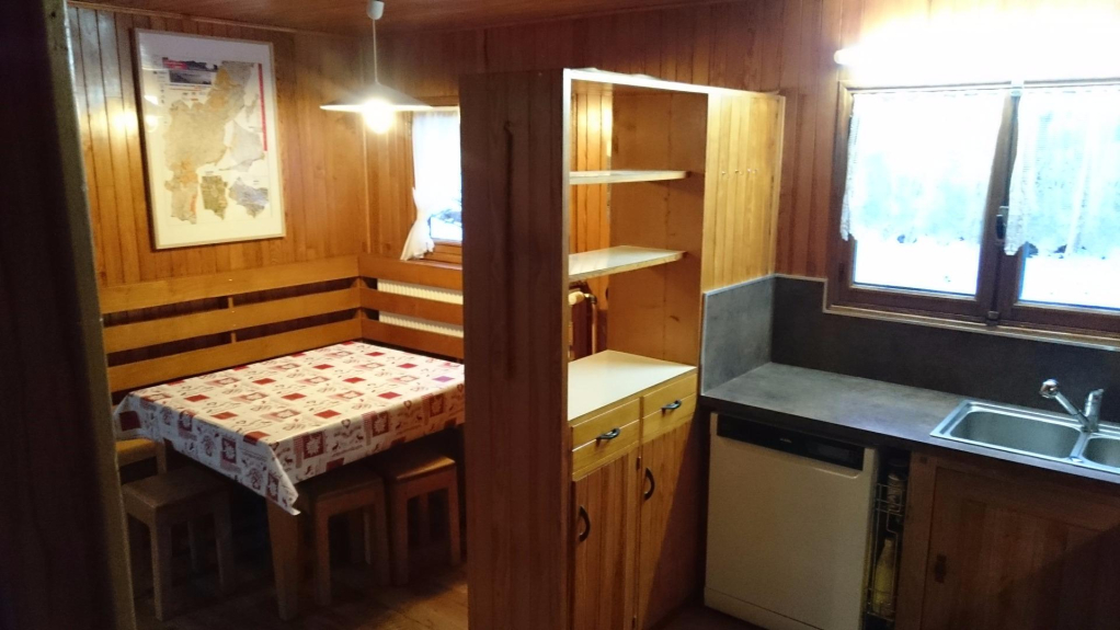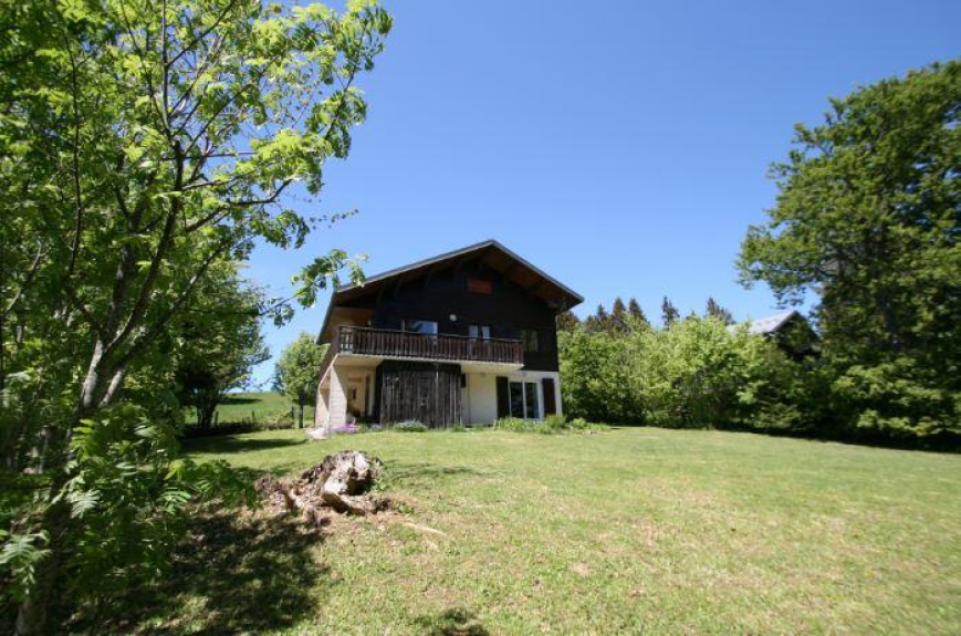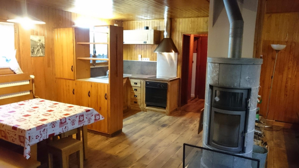 Chalet indépendant-Calme-chaleux-luminous-all comfort in der REVARD. Großes Wohnzimmer mit Kaminofen, gut ausgestattete amerikanische Küche, Balkon. Ideal für Familien.