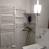 - Ein großes Badezimmer mit Heizkörper, Badewanne und Duschwand