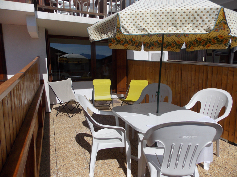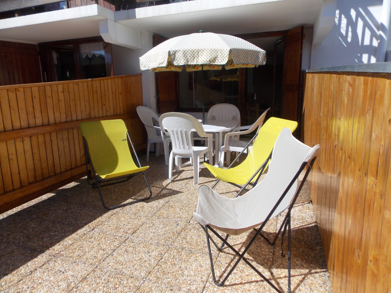 - Südterrasse (ausgestattet mit 3 Liegestühlen + Gartenmöbeln und Sonnenschirm), Skiraum und Parkplatz der Residenz.
