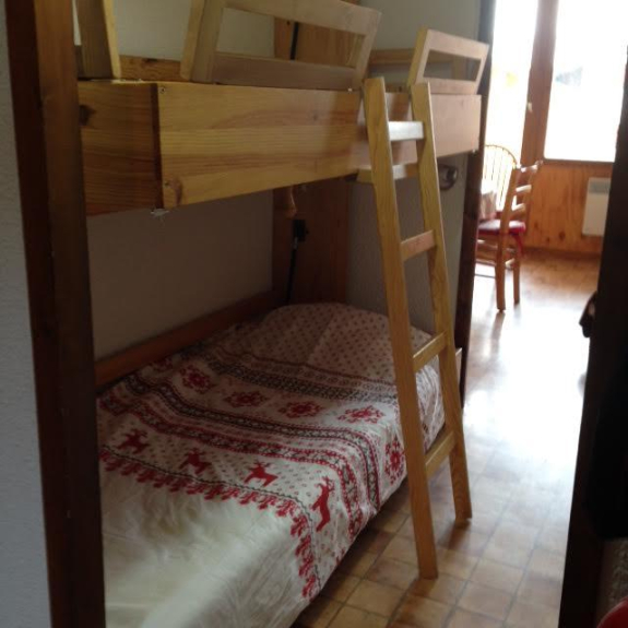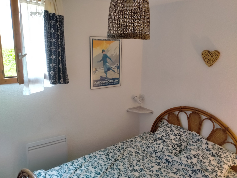 - 1 Schlafzimmer mit Fenster und Fensterläden (in Massivparkett) mit Bett 140 x 190 cm.