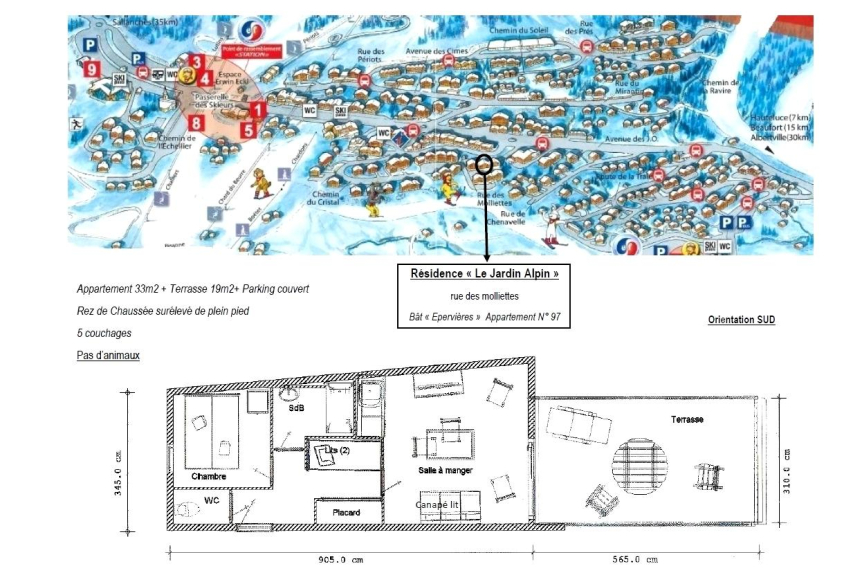 Das Hotel liegt im Zentrum von Les Saisies, große 2-Zimmer-Wohnung ALL COMFORT mit keine Treppe und ein Solarium Terrasse von 19 m2. Dieses geräumige, nach SÜDEN ausgerichtete und helle Appartement von 34 m² ist ideal für bis zu 5 Personen in der Residenz "Jardin Alpin".
