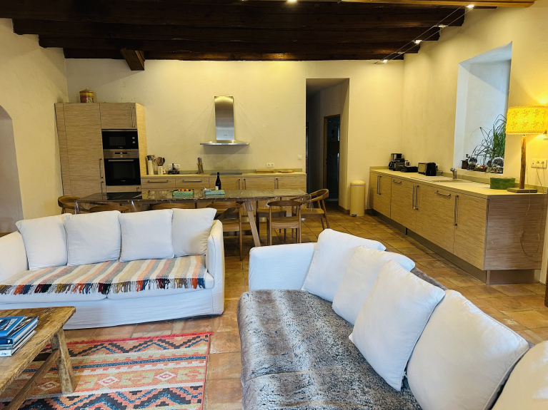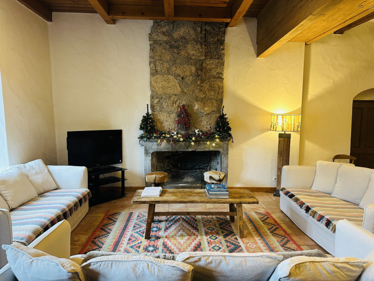 Im Erdgeschoss gibt es ein großes Wohnzimmer mit Kamin, eine 40 m2 große Küche, ein Schlafzimmer und ein Badezimmer.