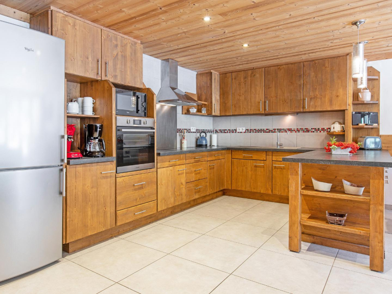 zum Wohnzimmer hin offene Küche (Geschirrspüler + Kühlschrank mit Gefrierfach + 4 Ceranfelder + Backofen + Grill + Mikrowelle + Kaffeemaschine + Toaster + Wasserkocher + Raclettegerät + Fondue-Set + Mixer); Satelliten-TV (Flachbildschirm); DVD-Player; Stereoanlage mit CD-Player; kostenloses WLAN; Haartrockner in allen Badezimmern; Handtuchtrockner; Waschmaschine; Trockner; Fußbodenheizung; 2 Terrassen; Grill; Skiraum; Schuhtrockner