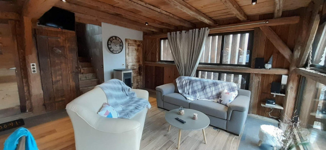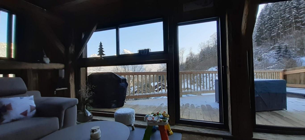 Die großen Erkerfenster im Wohnzimmer ermöglichen einen Blick auf das Giffre-Tal und geben Ihnen Zugang zur Terrasse.