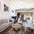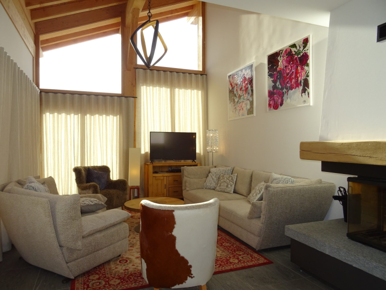 Angenehmes Wohnzimmer mit Kamin und Zugang zur Terrasse mit Whirlpool und Panoramablick auf die umliegenden Berge. TV und DVD-Spieler.