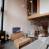 Voll ausgestattete Küche mit Essecke: Induktionskochfeld, Geschirrspüler, Backofen, Mikrowelle, Wasserkocher, Toaster und Kaffeemaschine.