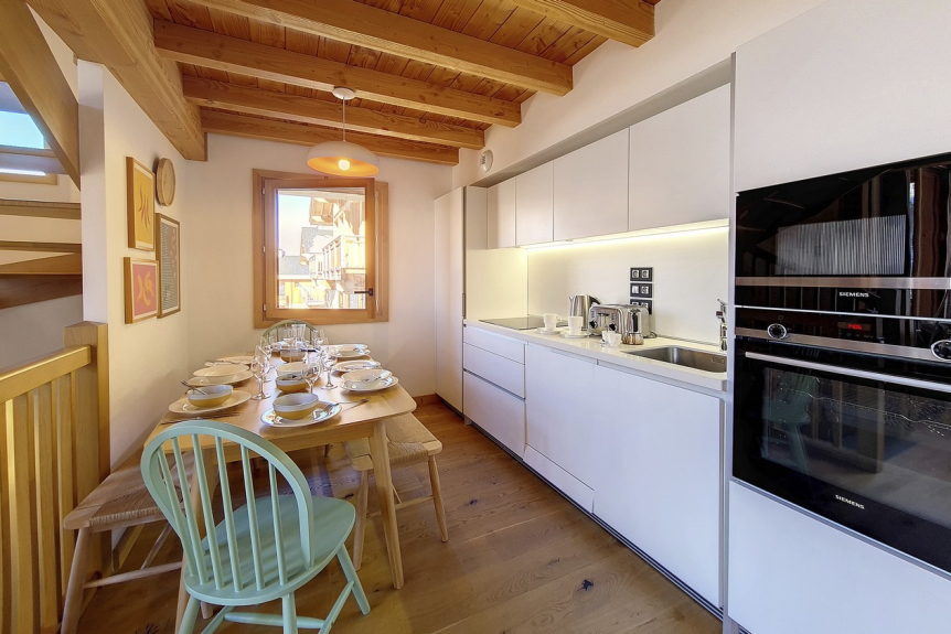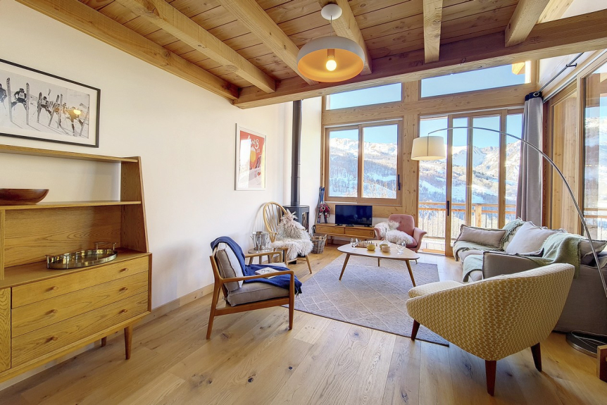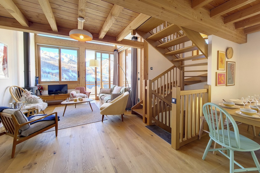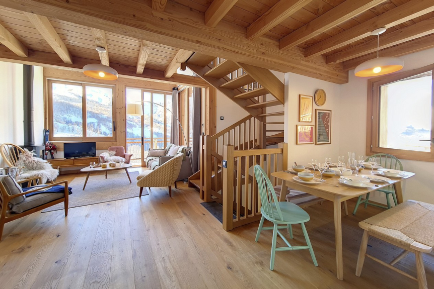 Pastellige Sanftheit rund um den Holzofen. Das Chalet CACHETTE ist ideal für Ihr Familientreffen (90m² für 8 Personen). Nur 2 Gehminuten von den Pisten entfernt (der Skiraum liegt direkt an der Piste), bietet dieses sonnige Chalet alle modernen Annehmlichkeiten und gleichzeitig die Kokon-Atmosphäre der Berge.