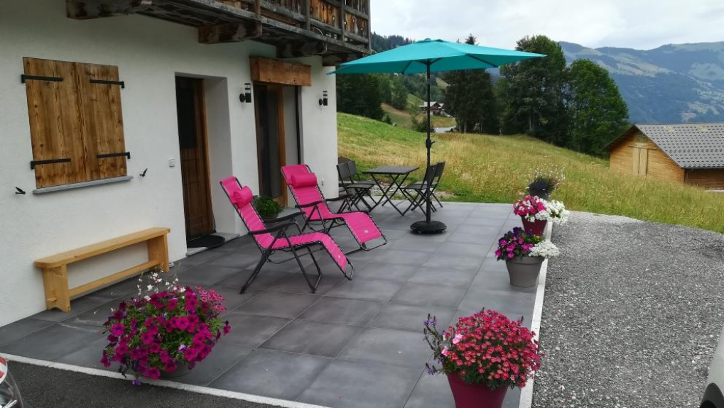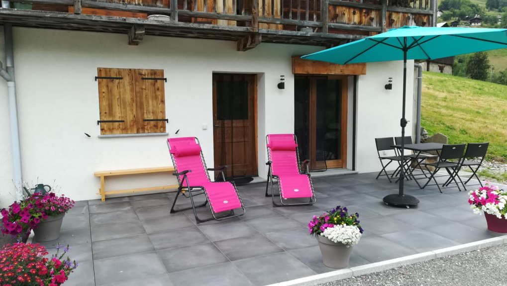 Draußen: 1 große Terrasse mit Tisch und Stühlen, Sonnenschirm für den Sommer, freie Sicht auf das Dorf Arêches und das Hauteluce-Tal.