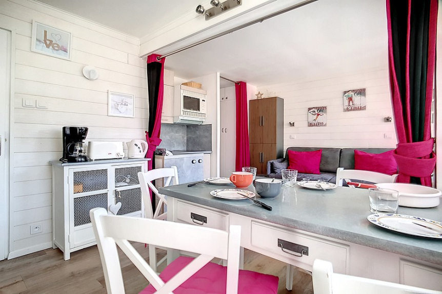 Das Studio für 4 Personen ist 24 m² groß. Es befindet sich im 2. Stock mit Aufzug und hat einen nach Südwesten ausgerichteten Balkon. Rollladen