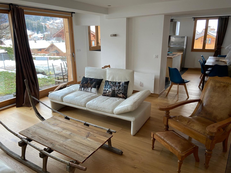 Großes Wohnzimmer mit Küche, Esszimmer und Sitzecke in idealer Lage, sehr sonnig und mit Blick auf die Pisten von Pleney
