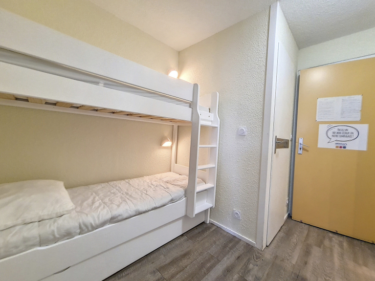 Bergecke (im Eingangsbereich, der durch eine Tür vom Wohnzimmer getrennt ist): 2 Etagenbetten für 1 Person.