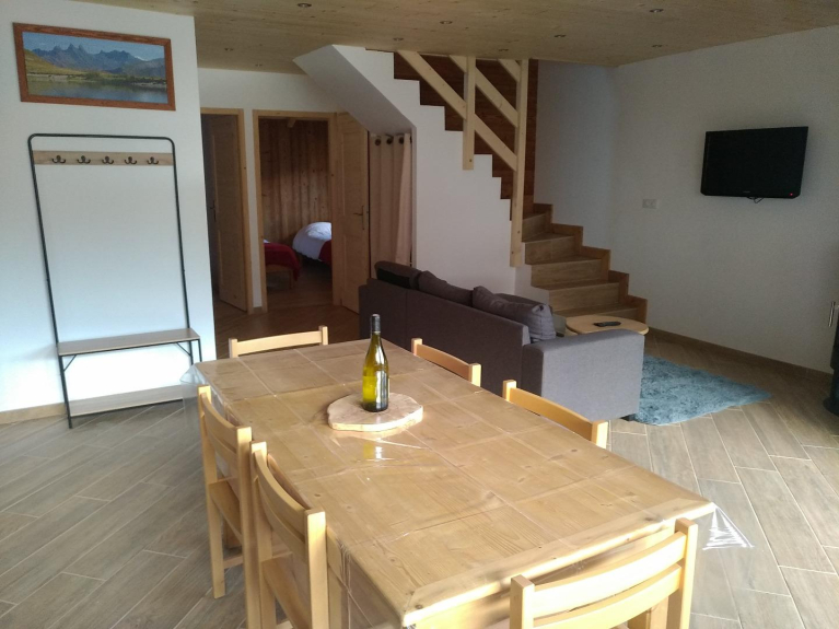 Küche offen zum Wohnzimmer, 1 WC, 1 Duschbad und 2 Schlafzimmer (9m2) mit 1 Doppelbett und 2 Einzelbetten