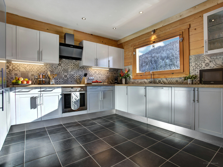 Das Chalet hat 4 Etagen und der Eingang befindet sich im 3. Stock. Sie kommen an einem Schlafzimmer mit Etagenbett und einem Duschraum vorbei, bevor Sie den schönen Wohnbereich betreten. Die große Küche bietet viel Platz, um ein Festmahl mit vielen Händen zu kochen, und der Essbereich öffnet sich zu einer großen Terrasse mit herrlichem Bergblick.