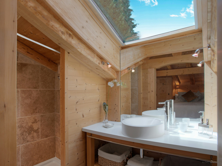 In der ersten Etage befindet sich der geräumige Hauptwohnbereich. Die hohen Decken und die Fensterwand sorgen für einen lichtdurchfluteten Raum, und von den Sofas im Wohnbereich aus haben Sie einen herrlichen Blick auf das Dorf. Außerdem gibt es hier zwei Esszimmer und eine voll ausgestattete Küche, die Lust auf Kochen macht.