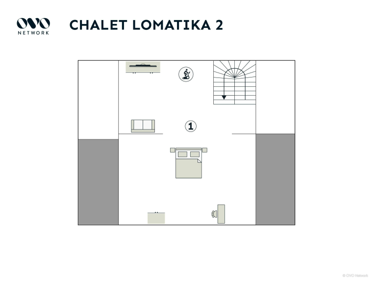 Das vierte Schlafzimmer nimmt das gesamte Dachgeschoss ein und ist daher sehr groß. Es besteht aus einem Wohnzimmer, einem Sportbereich und einem perfekten Raum für Ihre Yoga-Session. Natürlich wurde das Bett so positioniert, dass Sie die spektakuläre Aussicht genießen können.