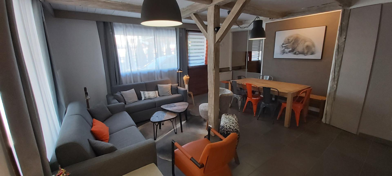 Schöne Wohnung von 120m2 in RCH und -1, mit Blick auf die Aiguille du Midi im Osten und auf den Kirchturm im Westen, Terrassenecke, Skischrank, 3 Schlafzimmer, 1 Bettecke 140x200, 1 Schlafsofa, 2 Bäder mit WC. Im Ortszentrum gelegen, 50 m von der Bäckerei und dem Sherpa, 50 m vom Shuttlebus und 800 m von den Pisten entfernt. 2 Außenparkplätze auf beiden Seiten der Wohnung.