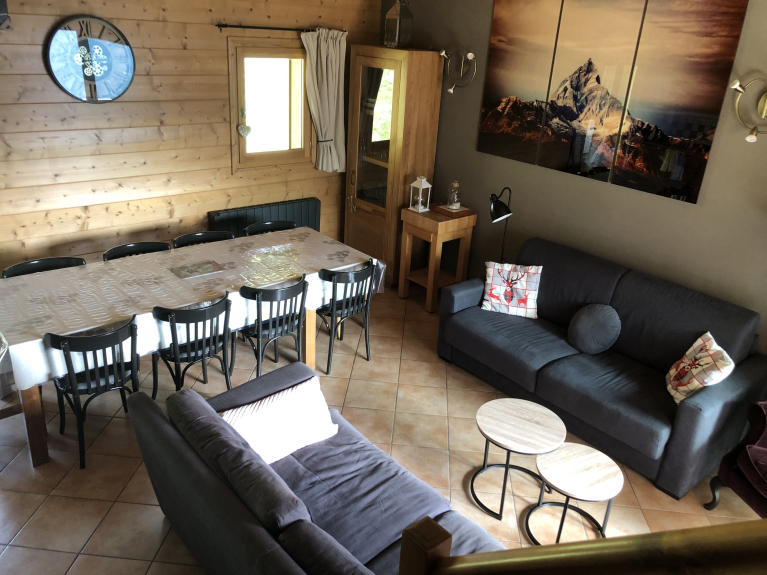 1. Ebene: Eingang, Elternsuite: Schlafzimmer 1 (1 Kingsize-Doppelbett 180x200) mit Badezimmer (Dusche und Waschtisch), separates WC, Küche und Wohnzimmer (großer Tisch, TV, Sofa für 3 Personen und Schlafsofa für 2 Personen 140x190), Nordbalkon und Südbalkon (schöner Blick auf das Beaufortain-Massiv und die Pierra Menta).