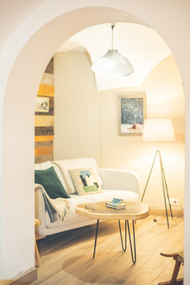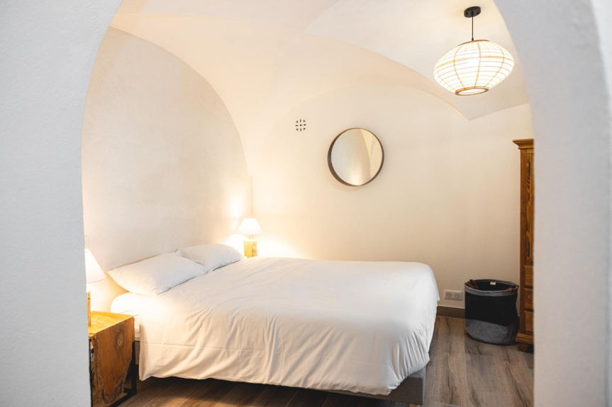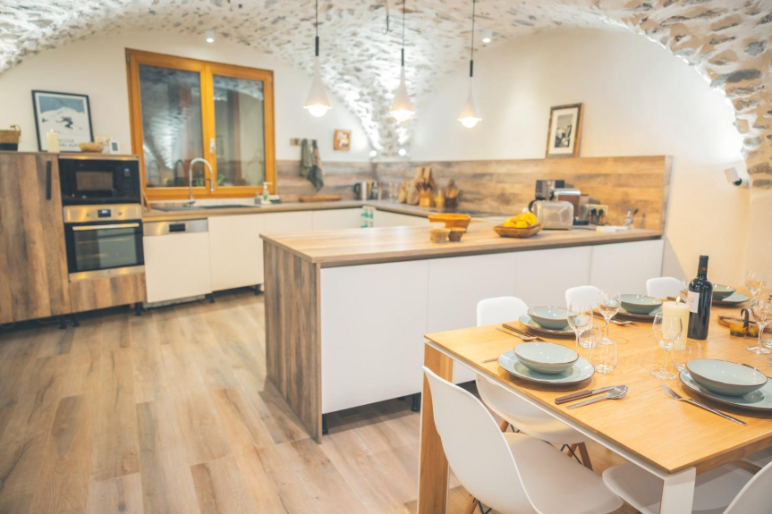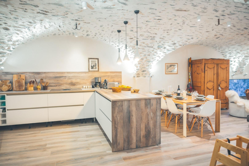 Das Erdgeschoss besteht links vom Eingang aus einem wunderschönen Raum mit Gewölbedecke, der eine sehr große Küche, einen Esstisch für 12 Personen und ein gemütliches Wohnzimmer mit einem Bio-Ethanol-Kamin umfasst.