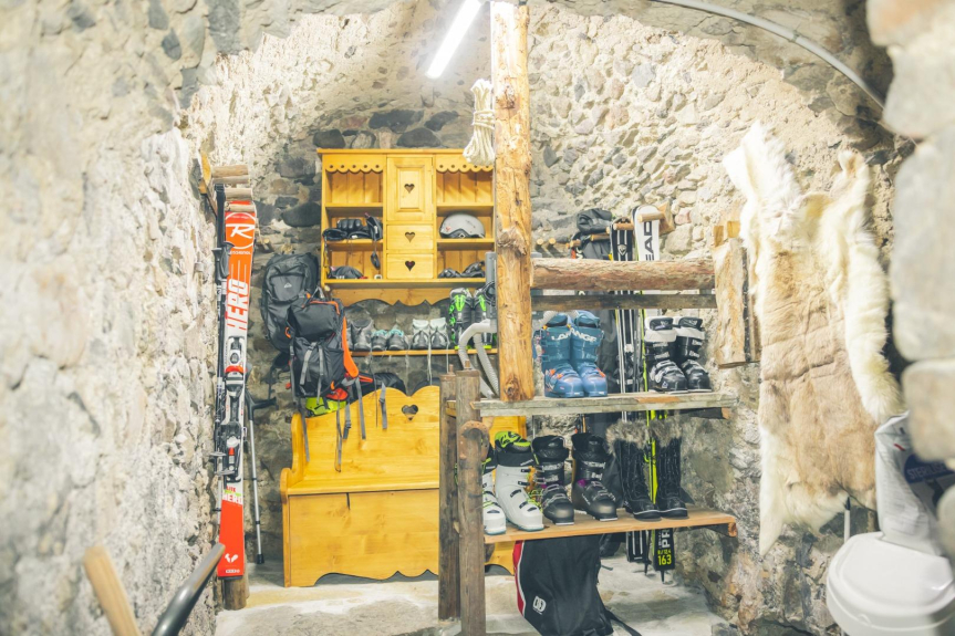 Auf der rechten Seite des Eingangs finden Sie ein zweites Wohnzimmer mit einem zweiten Fernseher, das an ein Schlafzimmer mit Doppelbett angrenzt. Im Eingangsbereich befinden sich eine Toilette und ein Skiraum.