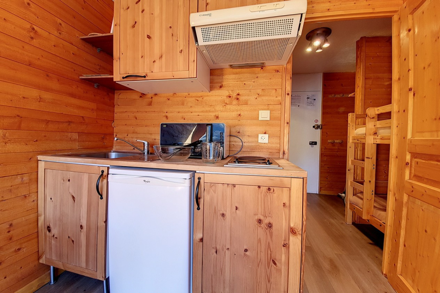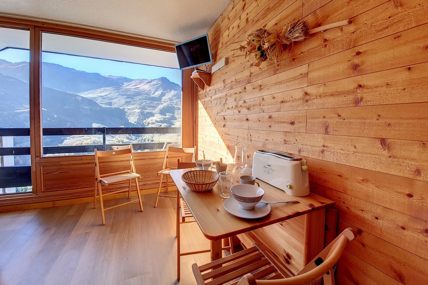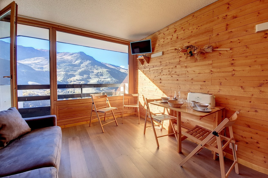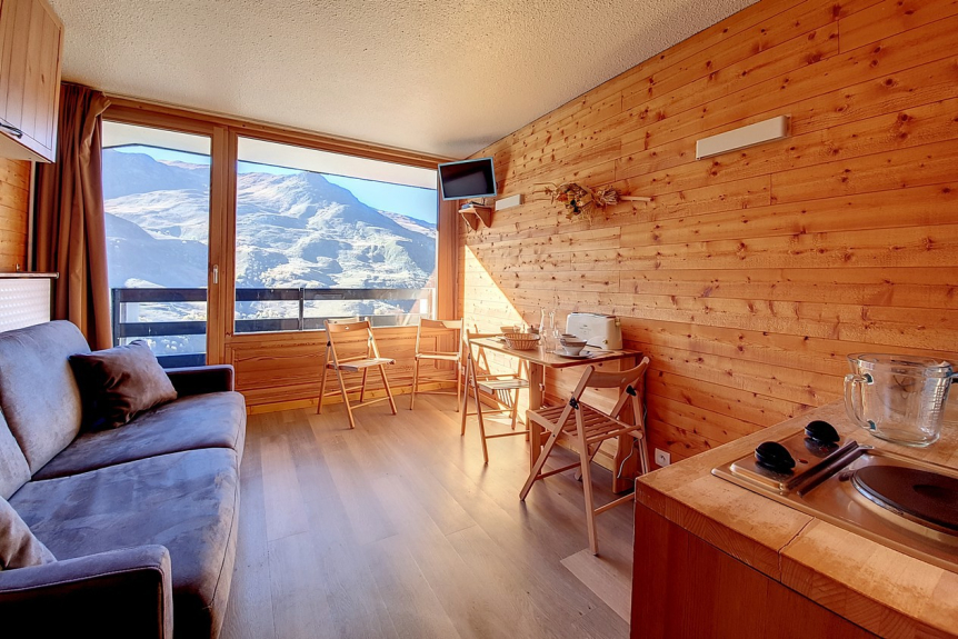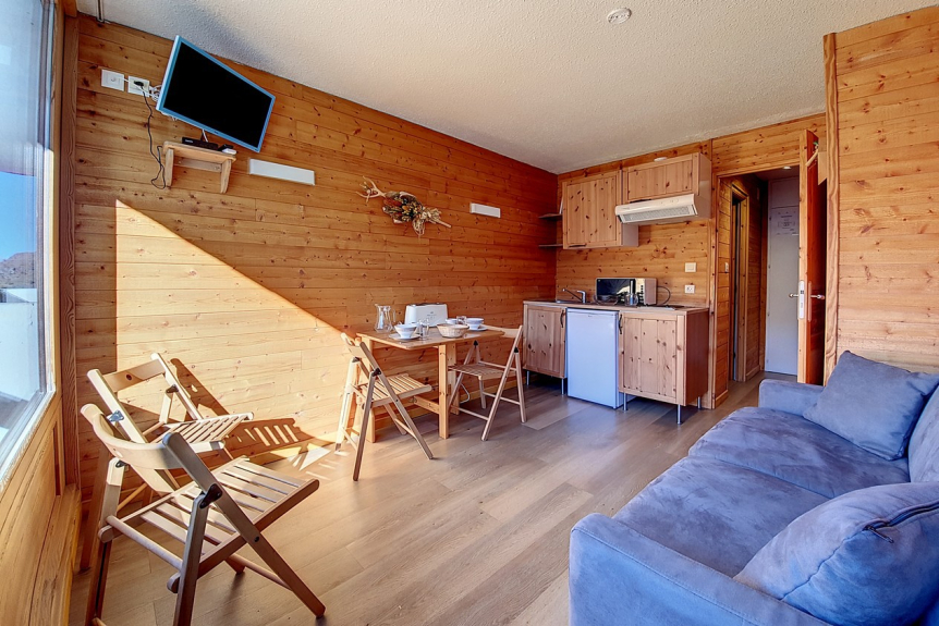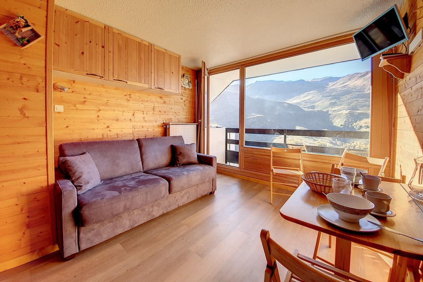 Komplett renoviertes, 18 m² großes Studio mit Bergecke für 3 Personen. Es befindet sich in der 8. Etage eines Wohnhauses mit Aufzug und verfügt über einen kleinen Balkon mit Nordwest-Ausrichtung (Blick auf Masse).