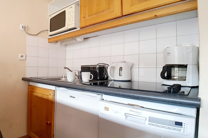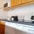 Küche mit 4 Ceranfeldern, Backofen, Mikrowelle, Kühlschrank, Geschirrspüler, Wasserkocher, Kaffeemaschine und Toaster.