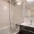 Einbauküche mit 2 Kochplatten, Kühlschrank, Backofen, Mikrowelle und Geschirrspüler, Wasserkocher, Toaster und Kaffeemaschine.