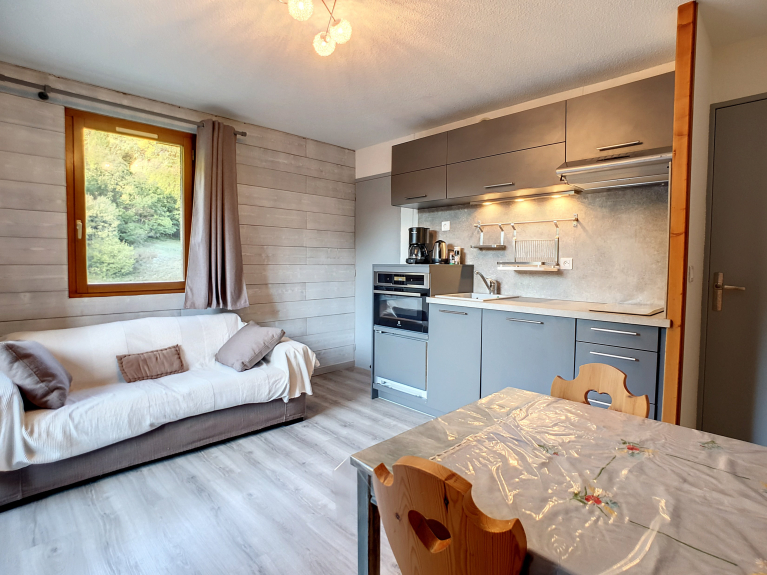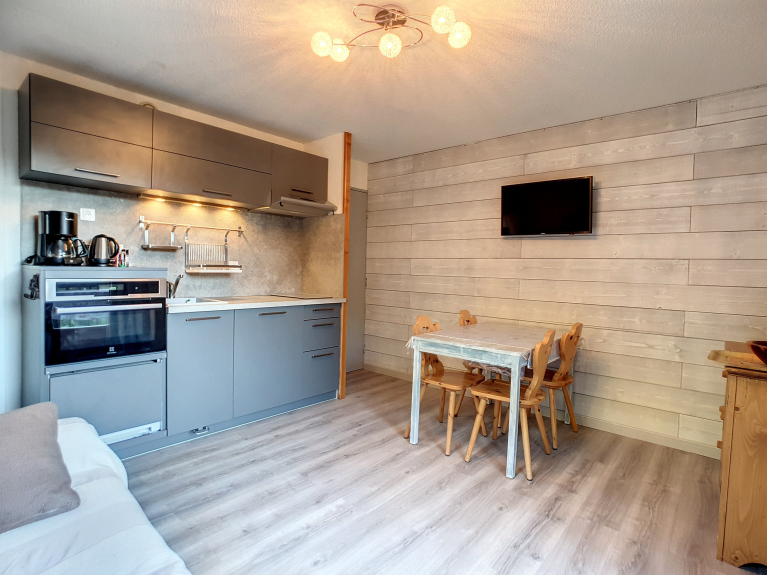 APPA LAUZIERES 8- Charmantes T2 mit Skiern an den Füßen. Stock einer Residenz im Herzen des Skiortes Pelvoux. Balkon mit Südausrichtung. Die Wohnung besteht aus einem Wohnraum mit ausgestatteter Küche , Sofa und Flachbildfernseher, einem Schlafzimmer, einer Bergecke, einem Duschbad mit Waschmaschine. Skifach.