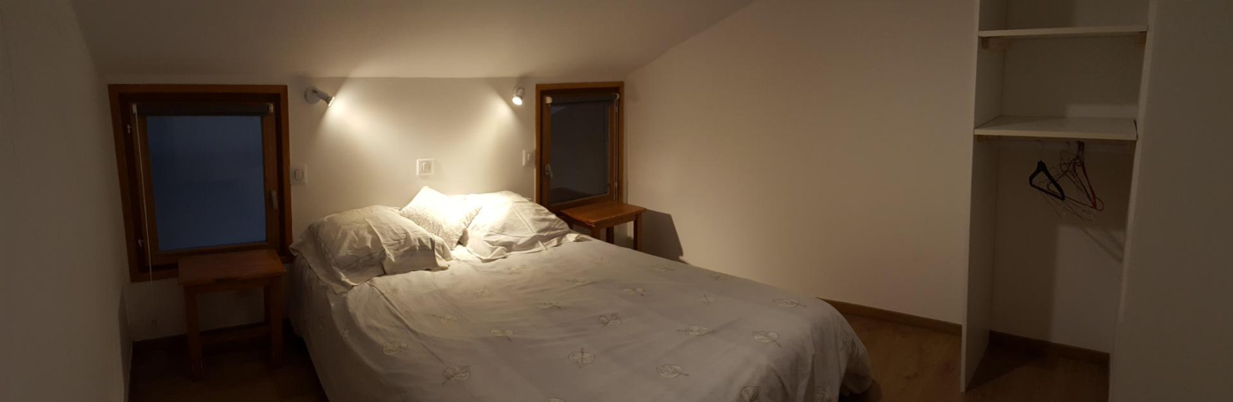 - ein Schlafraum unter der Schräge, der über das vorherige Zimmer zugänglich ist. Er verfügt über eine Matratze von 80x190, 2 Matratzen von 90*190 und eine von 140x190.