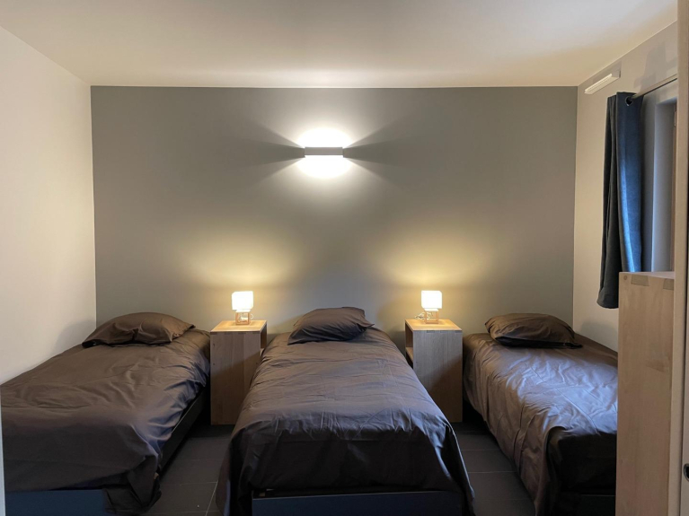 Im Inneren ist der Raum großzügig gestaltet und bietet Platz für bis zu 10 Personen in optimalem Komfort. Die 10 richtigen Betten, der geräumige Wohnbereich mit einem gusseisernen Ofen, die voll ausgestattete Küche, die gemütliche Bar, die zwei Badezimmer, die zwei Toiletten und sogar ein Arbeitsbereich machen das Chalet zu einem Ort, an dem man sich sofort wie zu Hause fühlt. Mit 4 Sternen klassifiziert, verbindet das „1904“ auf elegante Weise warmes Holz, Stein, Sichtbeton und moderne Ausstattung für einen Aufenthalt, der Authentizität und Luxus vereint.