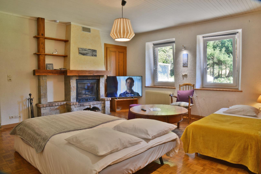 1 großes Wohnzimmer mit Kamin 1 Schlafsofa und 1 Einzelbett, großer Flachbildfernseher