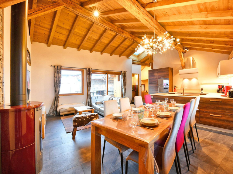 Das offene Wohnzimmer besteht aus einer voll ausgestatteten Küche, einem Essbereich mit dem großen Tisch für 8 Personen und einer Sofaecke, in der Sie sitzen und einen geselligen Moment am Holzofen verbringen können. Um sich nach einem Tag auf der Piste zu entspannen, gibt es nichts Besseres als eine Pause im Jacuzzi auf der Terrasse.