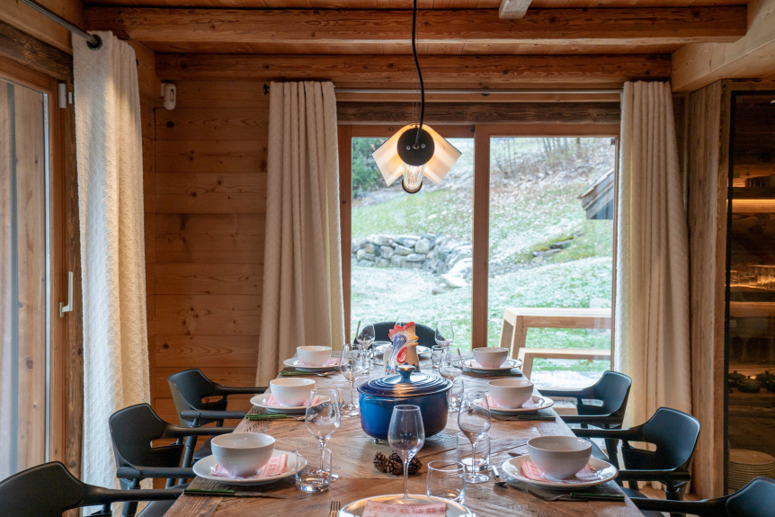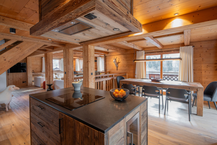 Das Chalet öffnet sich zu einem großen, vollständig mit Naturholz verkleideten Wohnraum. Er ist warm und gemütlich mit eleganten Möbeln, kuscheligen Teppichen und Kissen und einer Dekoration im Stil der Berge. Hier befinden sich ein Wohnzimmer mit einer Bibliothek und einem Kamin, ein gemütliches Esszimmer und eine moderne Küche. Die großen Fensterfronten bieten Ihnen einen freien Blick auf das Val d'Arly.