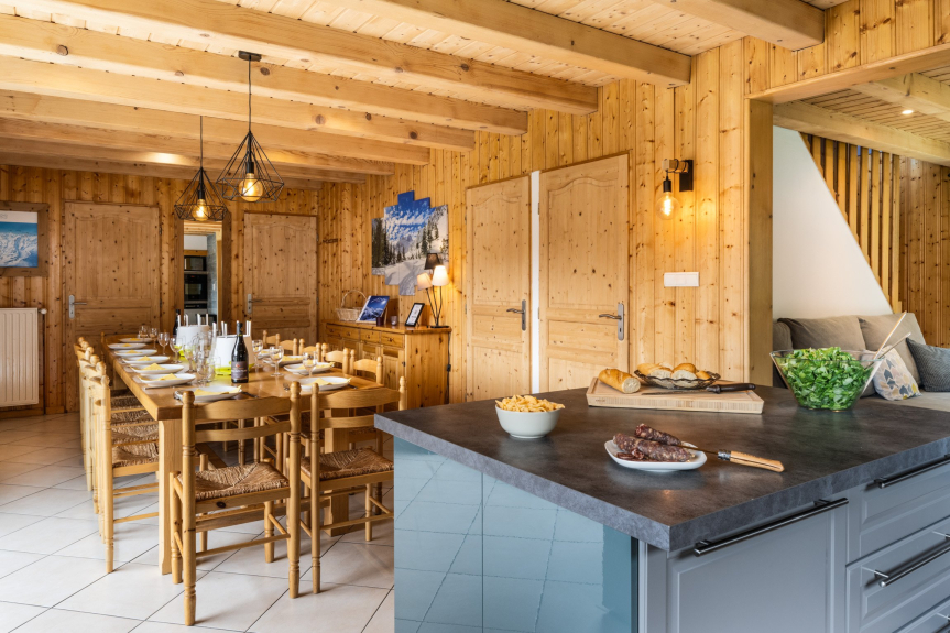 Das warme Herz unseres Chalets ist zweifellos der Kamin, wo Sie sich mit Ihren Lieben treffen und sich beim Knistern der Flammen entspannen können. Aber auch die schöne, offene und perfekt ausgestattete Küche sowie der große Tisch, an dem Sie Ihre Mahlzeiten gemeinsam einnehmen werden.