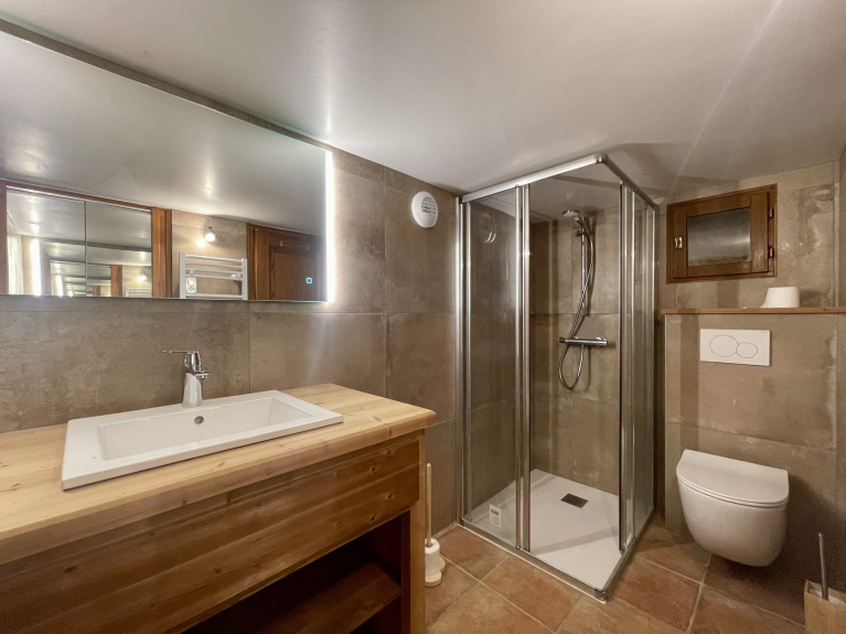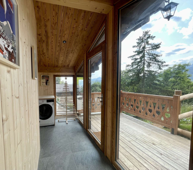 *1. EBENE: Waschküche mit Waschmaschine/Trockner und Sonnenterrasse mit Blick auf den Mont Charvin. Badezimmer mit begehbarer Dusche (Achtung, Deckenhöhe <1,90m). Zugang zur oberen Etage über die Wendeltreppe.