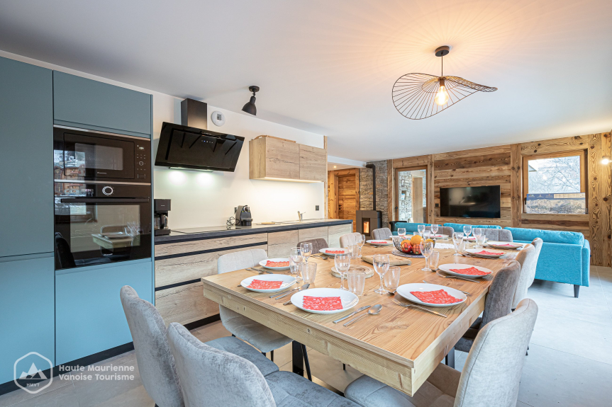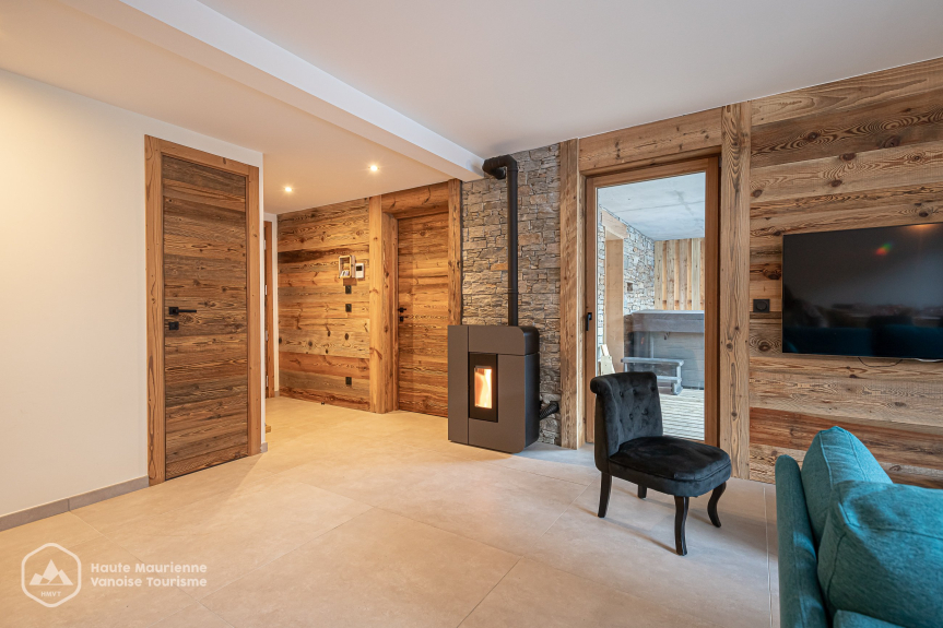 Das Chalet du vieux moulin befindet sich im Weiler Champs, zwischen Lanslebourg und Lanslevillard. Steine, Schiefer und Holz sind die wichtigsten Materialien, die sowohl im Außen- als auch im Innenbereich verwendet wurden.
