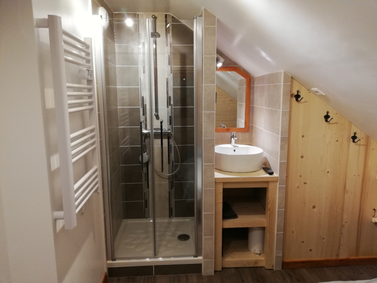1 Schlafzimmer mit einem Doppelbett mit eigener Dusche und Waschbecken, TV.