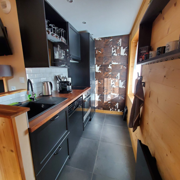 1 Küche mit Backofen, Mikrowelle, Geschirrspüler, Raclette-Gerät, Induktionskochfeld.