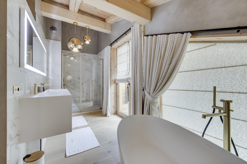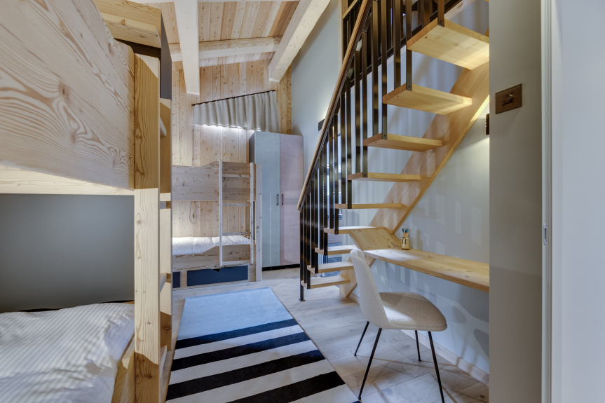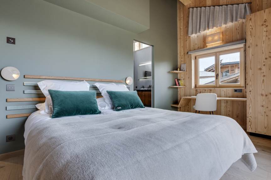 Er besteht aus 5 Schlafzimmern, alle mit eigenem Badezimmer. Das große Hauptschlafzimmer, das sich auf der obersten Ebene des Chalets befindet, verfügt über ein kleines Wohnzimmer, einen Arbeitsbereich, ein Badezimmer mit Dusche und Badewanne sowie eine Toilette.