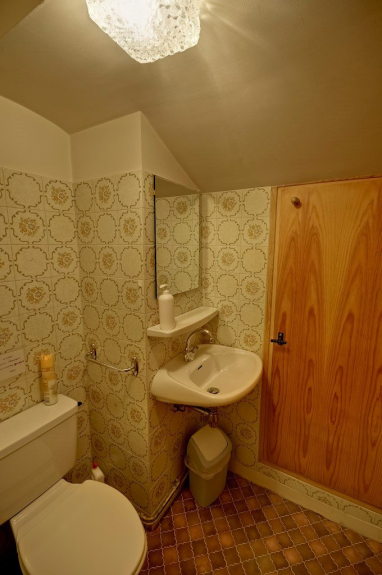 - Ein Badezimmer: Waschbecken mit kleiner Ablage und Spiegel, Bidet, Badewanne (Föhn vorhanden).