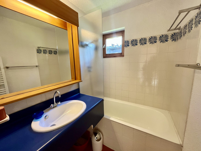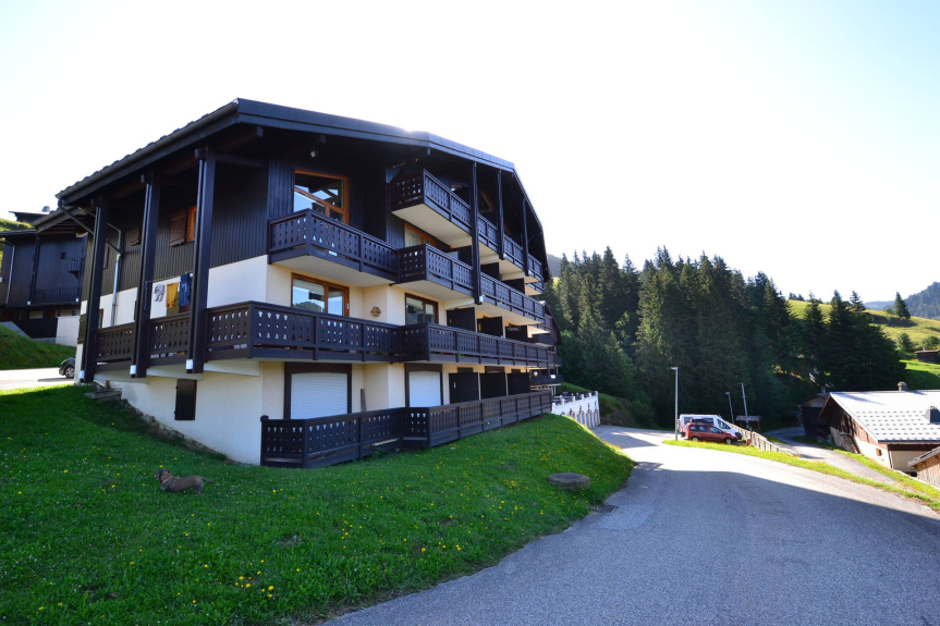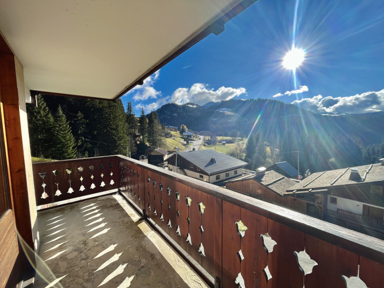 Zwei-Zimmer-Wohnung für sechs Personen, im ersten Stock, mit einer Fläche von 37 m² und einem großen Balkon in der Ecke SÜD/OST mit Blick auf den Mont Charvin und das Tal.