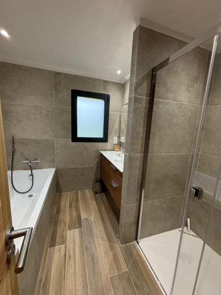 1 separates Badezimmer mit Dusche, Badewanne und Doppelwaschbecken.
