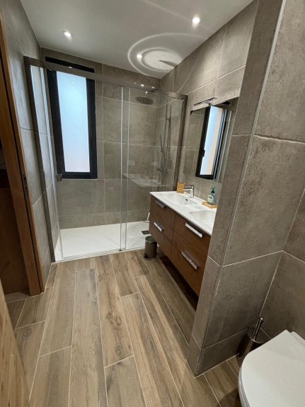 1 Master-Schlafzimmer mit 1 Bett 160, TV und Badezimmer mit Dusche, Doppelwaschbecken und WC.