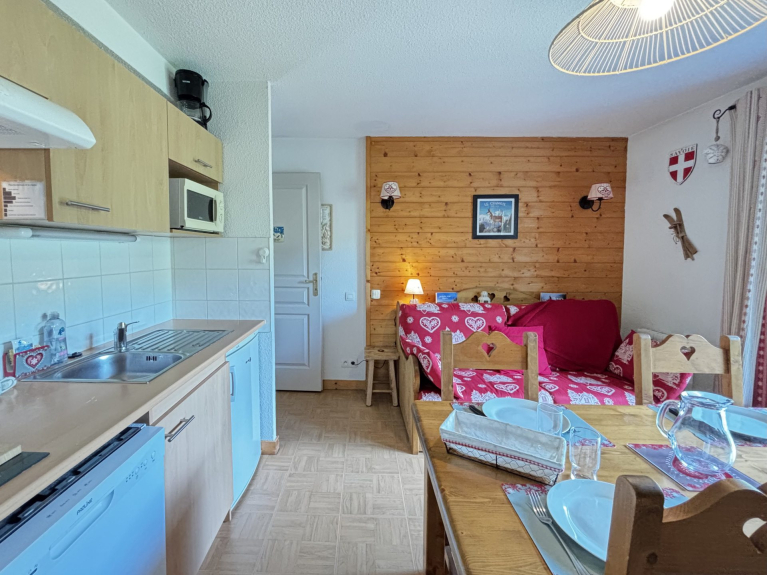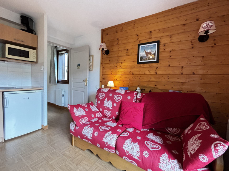 Die Residenz Les Chalets des Evettes mit Pool befindet sich am Fuße der Pisten des Espace Diamant und der Skischule. Dorfzentrum 3km entfernt.
