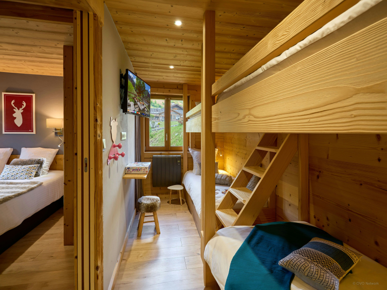 Die Wohnung verfügt über insgesamt drei Schlafzimmer, zwei Doppelzimmer und einen Schlafsaal für vier Personen mit Etagenbetten, der ideal für Kinder ist. Eines der Doppelzimmer verfügt über ein eigenes Duschbad, während das andere je nach Bedarf mit zwei Einzelbetten ausgestattet werden kann.