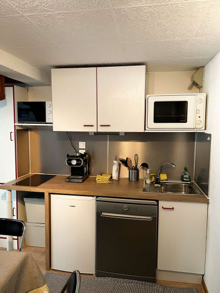 Kochecke: Backofen, Mikrowelle, Geschirrspüler, Kühlschrank 120L, Induktionskochfeld mit 2 Kochstellen, . 1 Filterkaffeemaschine, 1 NESPRESSO-Kaffeemaschine, 1 Wasserkocher, 1 Toaster, 1 Raclettegerät, Stabmixer.